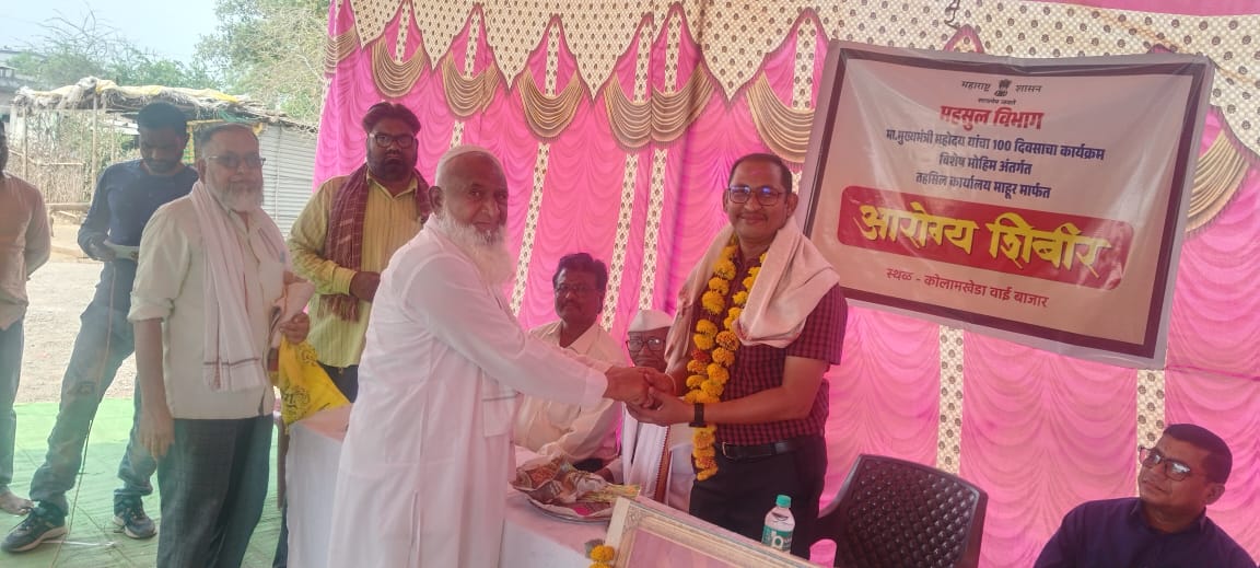 प्रा आ केंद्र वाईबाजार अंतर्गत ग्राम कोलामखेड येथे मा मुख्यमंत्री महोदय यांचा १०० दिवसांचा कार्यक्रम विशेष मोहीम अंतर्गत आरोग्य तपासणी शिबीर घेण्यात आले यामध्ये आज रुग्णांची NCD स्क्रिनिंग करण्यात आली यामध्ये HB , रक्तदाब ,मधुमेह ,मुखाचा कर्करोग ,स्तनाचा कर्करोग ,गर्भपिशवीचा कर्करोग ,Co morbid रुग्ण इत्यादी बाबींची आरोग्य तपासणी करण्यात आली तसेच शाळेतील विद्यार्थ्यांची आरोग्य तपासणी यामध्ये HB इत्यादी बाबींची तपासणी करण्यात आली यावेळी माहूरचे नायब तहसीलदार श्री राजकुमार राठोड साहेब ,वाई ग्रामपंचायत चे सरपंच श्री सीताराम मडावी , उपसरपंच श्री उस्मान खान पठाण ,सर्व ग्रामपंचायत सदस्य , आरोग्य विभागातर्फे समुदाय आरोग्य अधिकारी डॉ पुंडलिक भुरके , डॉ वैभव लहाने ,श्री लक्ष्मण जोगपेठे ,श्रीमती व्ही पी नेताम ,श्री गिरीश कुलकर्णी ,श्रीमती हर्षना भगत ,श्रीमती सुलोचना राठोड ,श्रीमती उषा वाघमारे ,कु गीतांजली मडावी ,श्री बालाजी मोरे ,श्री विठ्ठल कोत्तापल्ले ,श्री संतोष घुगरे ,श्री सुमित सूर्यवंशी ,श्री सुदर्शन गेडाम ,श्री हनमंत अंदुलगे , सर्व आशा ताई इत्यादी उपस्थित होते .